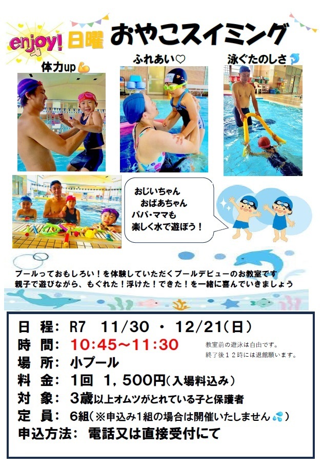 持 ち 物 ※1指定水着(ハーネス)・※2水遊び用おむつ・タオル スイミングキャップ(見える所に名前記入) ※1 販売があります ※2 プールで販売してます