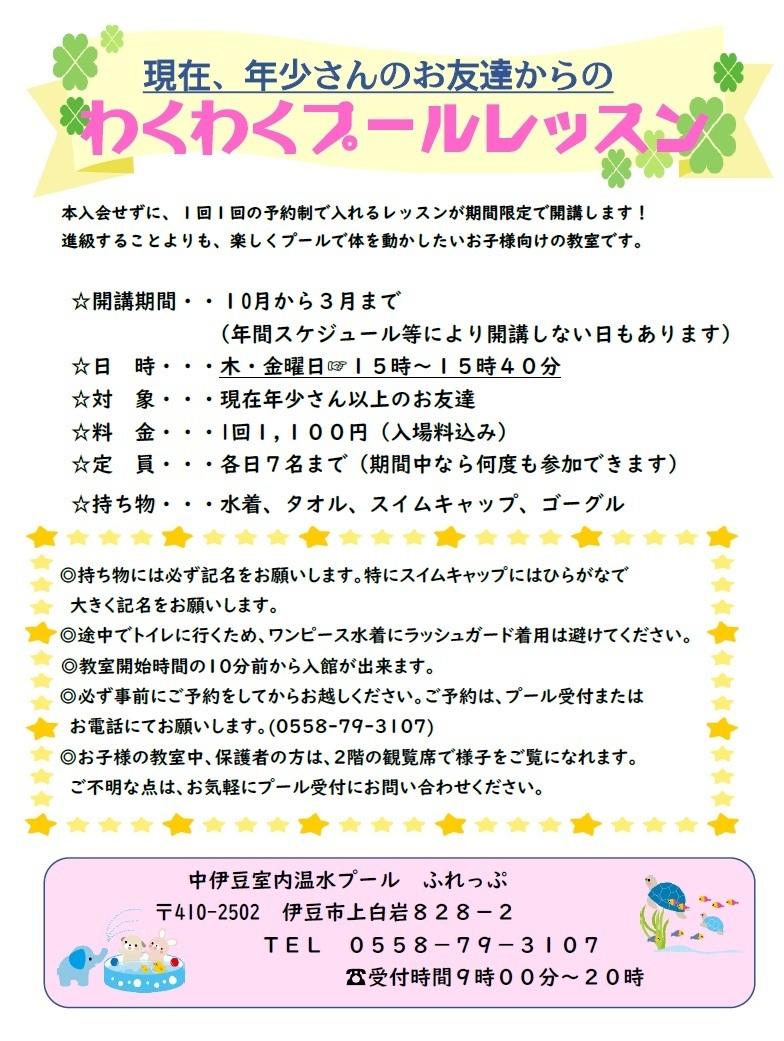 教室の体験もできます!(一人1回のみ・体験料1100円⦅入場料込⦆)受付、またはお電話でご予約ください。