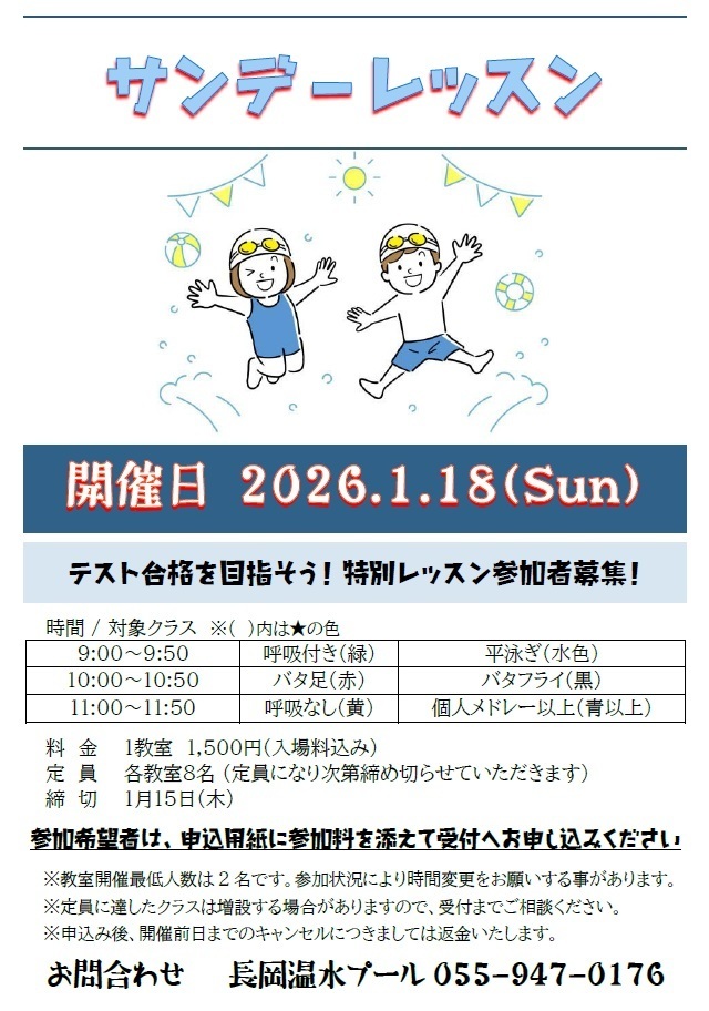 1月18日(日)に、長岡温水プールにて「サンデーレッスン」を開催いたします。