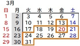 □で囲まれた日が開催日です